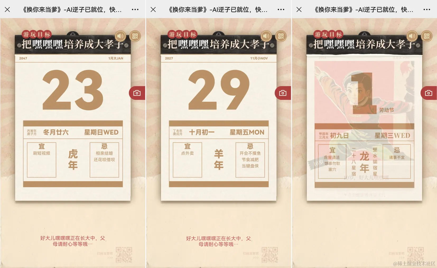 游戏团队另一个聪明的处理,是将生成的等待时间做成了「撕日历」的动画。一下子就带入了!好像真的经历了岁月流逝,看到好大儿一点点长大。