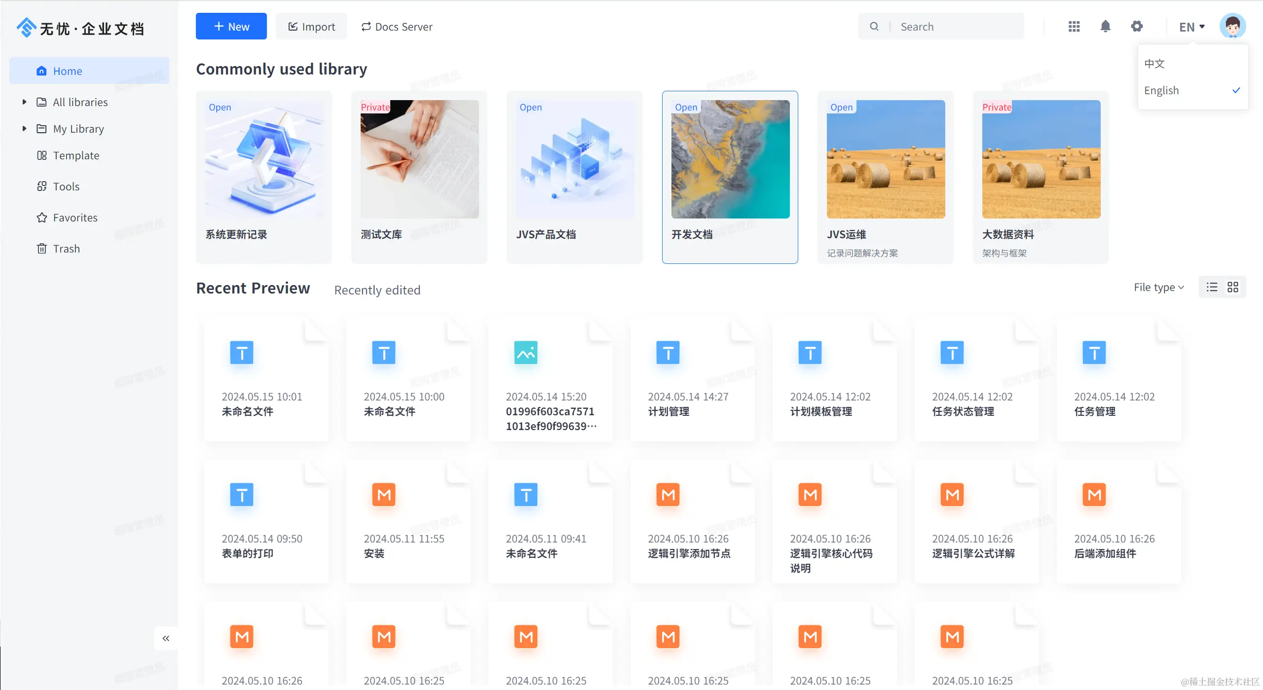 无忧企业文档提供了系统语言切换功能,内置了英语语言包,在企业级文档管理系统或相关软件中,用户可以根据需要轻松切换系统界面的显示语言。