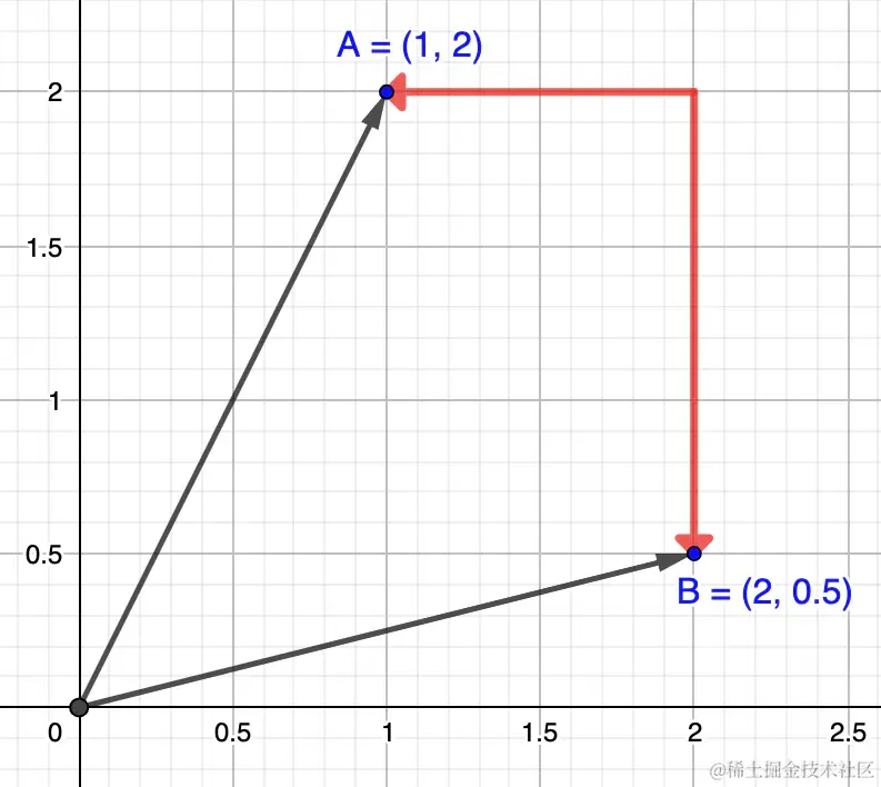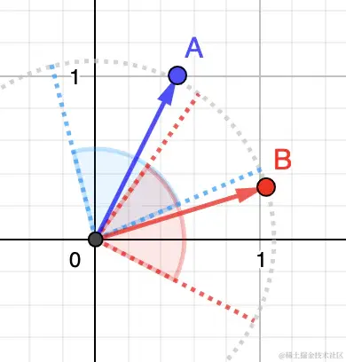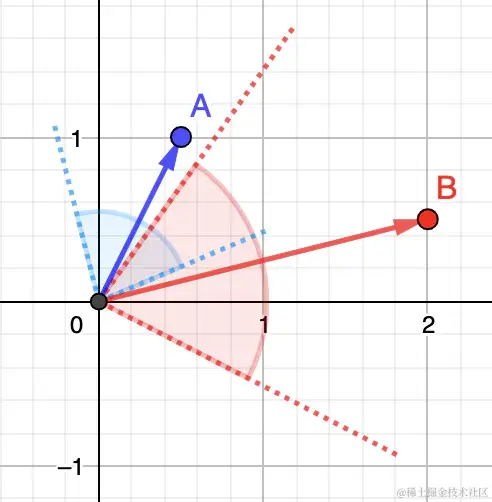 更长)。B 可能正在看着地平线上远处的一座山,而 A 可能正在看着附近的一棵树。 对于余弦相似度,这不起作用,因为它仅与角度有关。