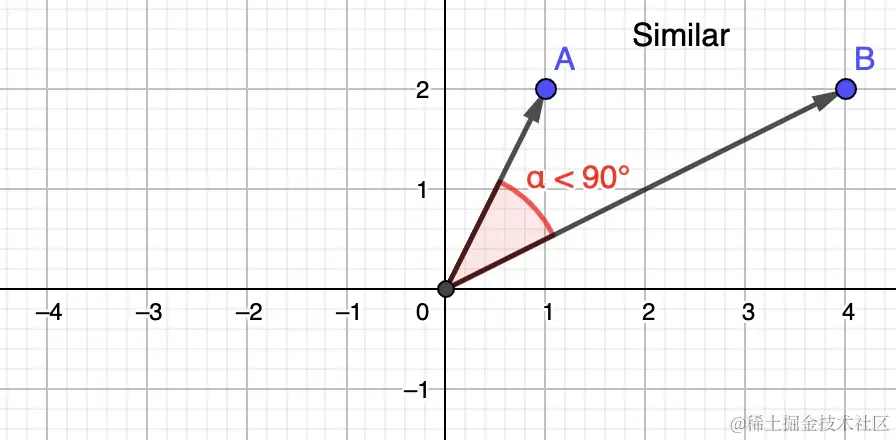 之间的距离,而是它们的相对角度,即它们是否都指向大致相同的方向。 相似度
