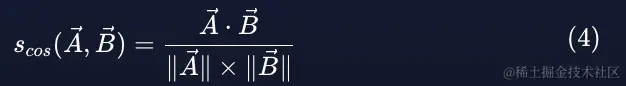 现在让我们计算余弦相似度。 公式 (4) 非常简单,其中分子由两个向量的点积组成,分母包含它们的大小(即它们的长度)的乘积: