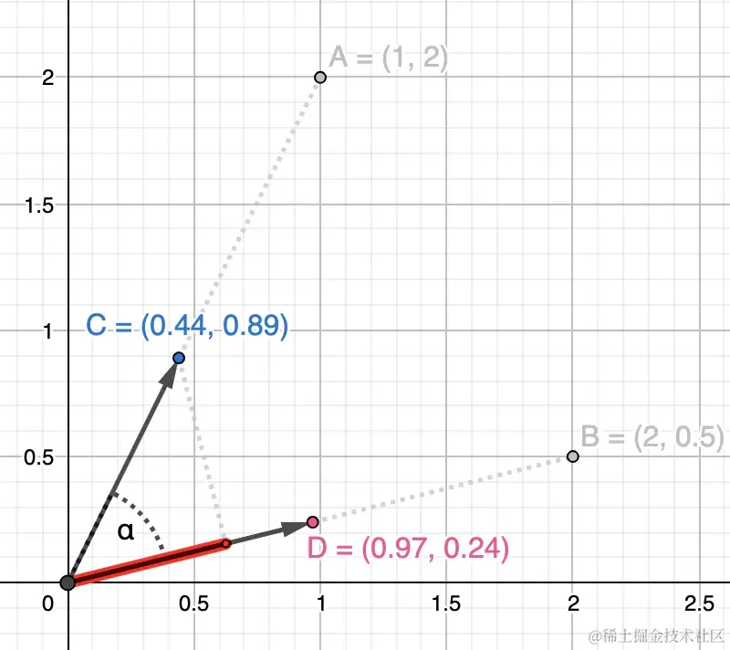 在介绍点积相似度公式之前,我们先快速了解一下如何对向量进行归一化。 这非常简单,只需两个简单的步骤即可完成: