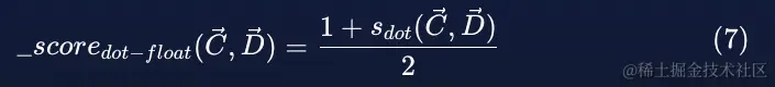 利用点积相似度时,根据向量是否包含浮点值或字节值,计算分数的方式有所不同。 在前一种情况下,分数的计算方式与余弦相似度相同,使用下面的公式 (7):