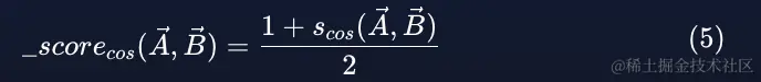 为了从任何余弦相似度值中得出正分数,我们需要使用下面的公式(5),它将余弦相似度值在 [-1,1] 之间震荡,而分数介于 [0. 1] 之间: