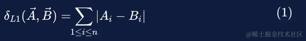 距离越小,两个向量越接近。 L1 距离公式(1)非常简单,如下所示