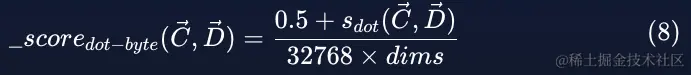然而,当向量由字节值组成时,评分的计算方式略有不同,如下面的公式(8)所示,其中 dims 是向量的维数: