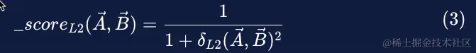 就评分而言,两个向量之间的距离越小,它们就越接近(即越相似)。 因此,为了得出分数,我们需要反转距离度量,以便最小的距离产生最高的分数。 使用 L2 距离计算分数的方式如下式(3)所示: