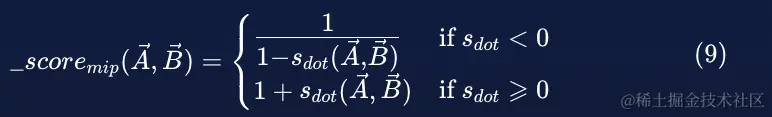 计算最大内积相似度的公式与点积一(6)完全相同。 改变的是通过使用分段函数缩放最大内积相似度来计算分数的方式,分段函数的公式取决于相似度是正还是负,如下面的公式(9)所示: