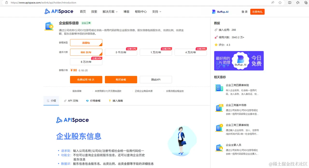 选择合适的API:研究市场上不同的API提供商,选择服务稳定、数据准确的API,如 APISpace 的 企业股东信息API。
