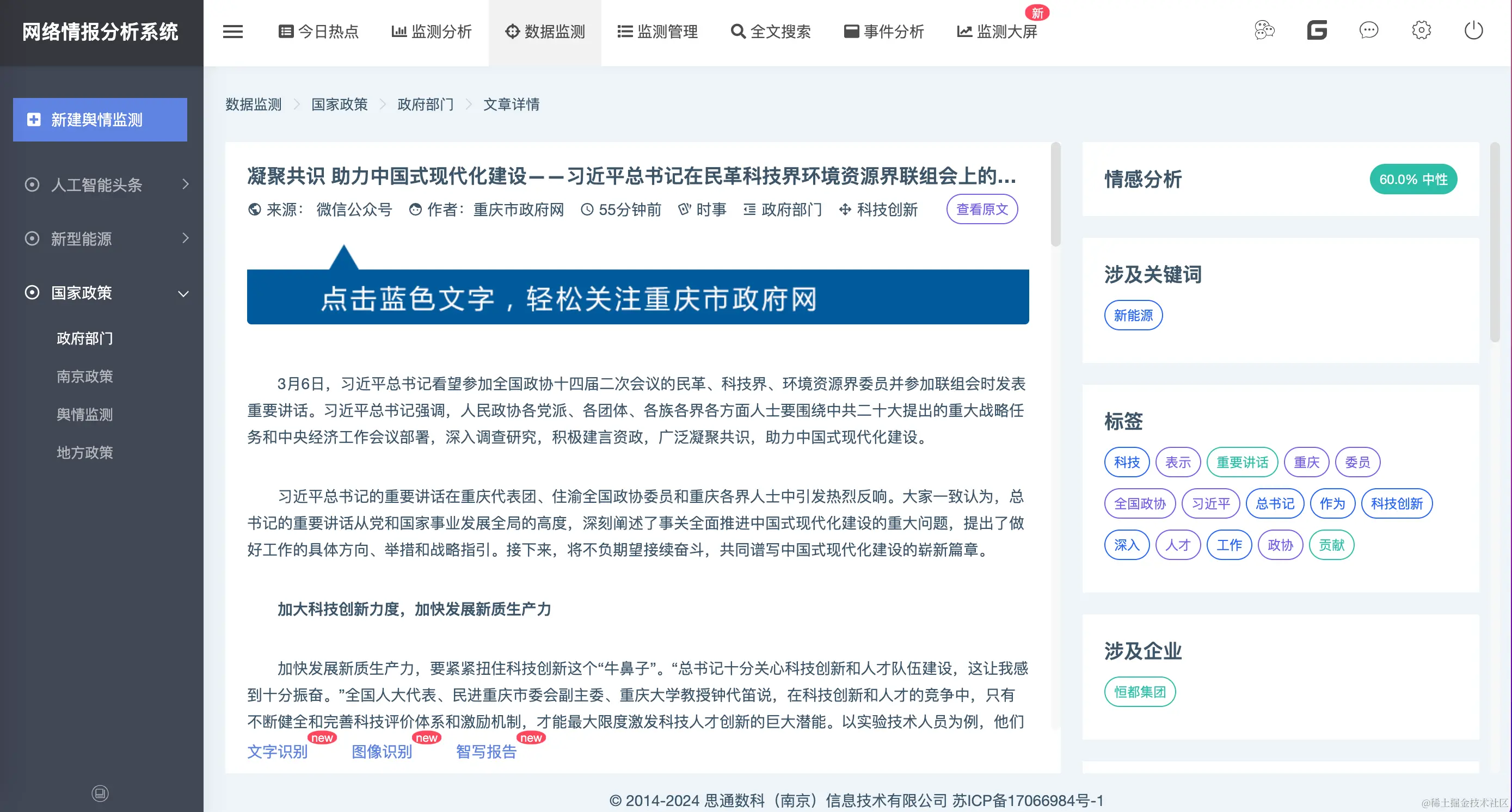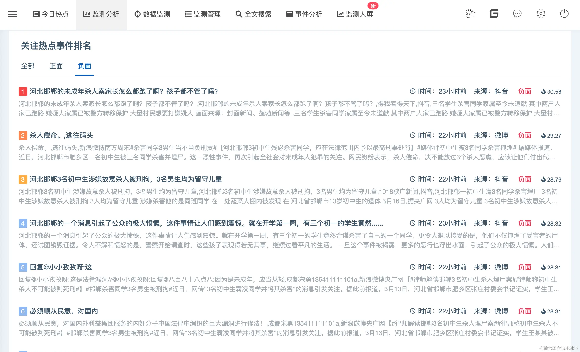 敏感词监测:建立一个敏感词库,对所有收集到的信息进行实时监测,一旦发现敏感词汇,立即进行标记。同时还可以利用自然语言处理算法对正负面进行识别。