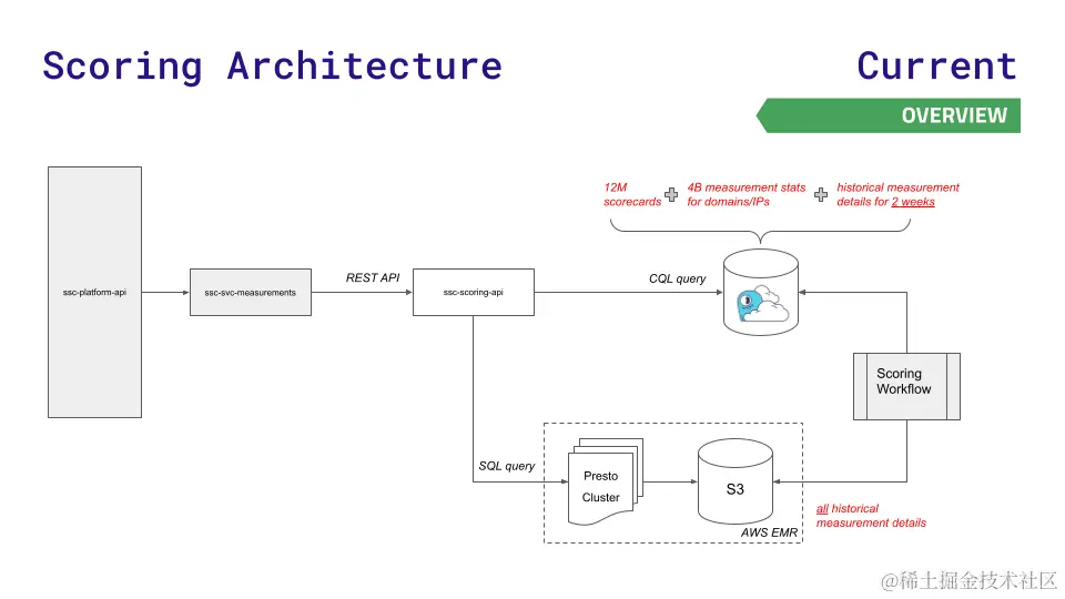 团队之前的数据架构在一段时间内为他们提供了良好的服务,但无法跟上他们的增长速度。他们的平台 API 查询了三个数据存储中的一个:Redis(用于更快地查找 1200 万张记分卡)、Aurora(用于存储跨节点的 40 亿个测量统计数据)或 Hadoop 分布式文件系统上的 Presto 集群(用于对历史结果进行复杂的 SQL 查询)。