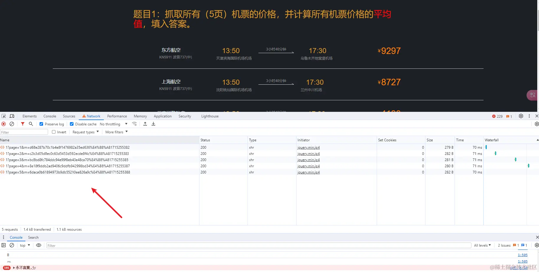 题目1:抓取所有(5页)机票的价格,并计算所有机票价格的平均值,填入答案。