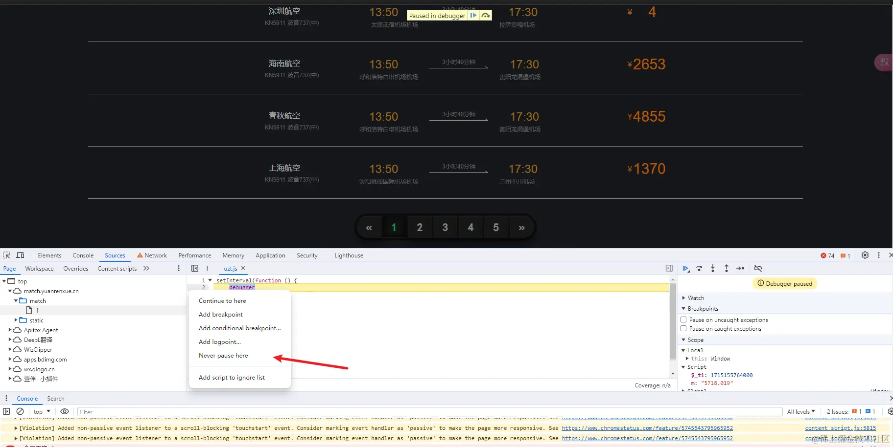 在debugger位置,点击行号,右键Never pause here,永远不在此处断下,然后重新刷新就可以过这第一个小坑。