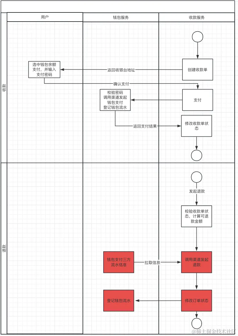 上图是我们存在一个版本的钱包收退款方式流程退,可以看到标红的流程节点和收款流程不一致,在收款的阶段,收款服务扮演了路由的角色,主要的收款逻辑(和渠道完成交互,登记流水)是钱包服务完成的。在退款阶段,收款服务却大包大揽,由收款服务去完成钱包的主要退款逻辑,这样带来的问题是
