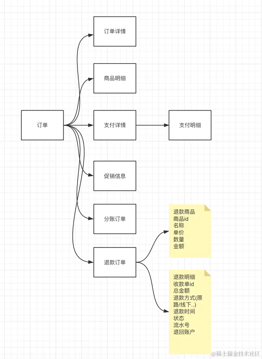 在业务系统中,退款一般都是根据业务订单去退款的,复杂的时候结构可能为: