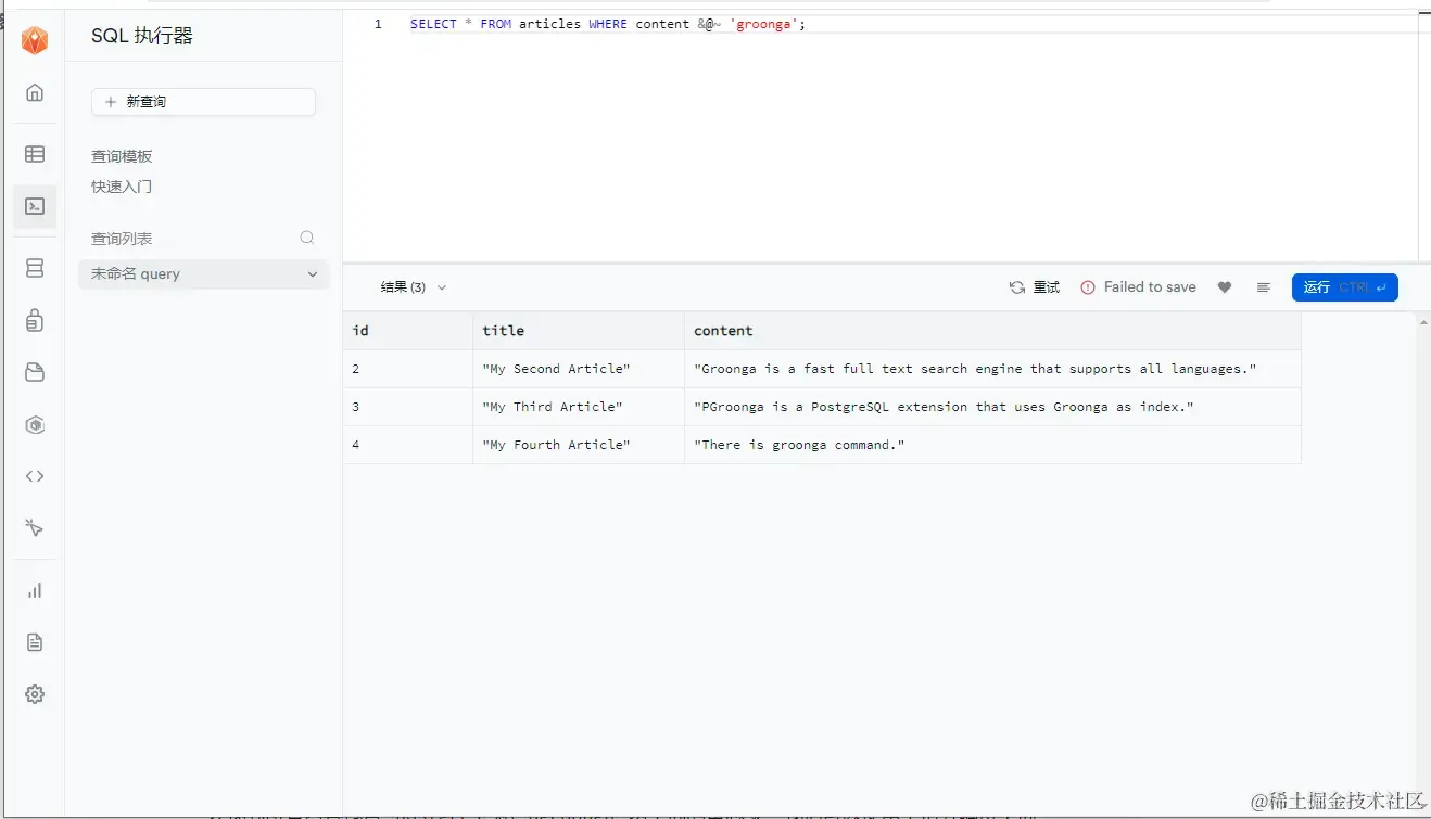 以下是一个简单的示例,展示如何使用 PGroonga 进行全文搜索。