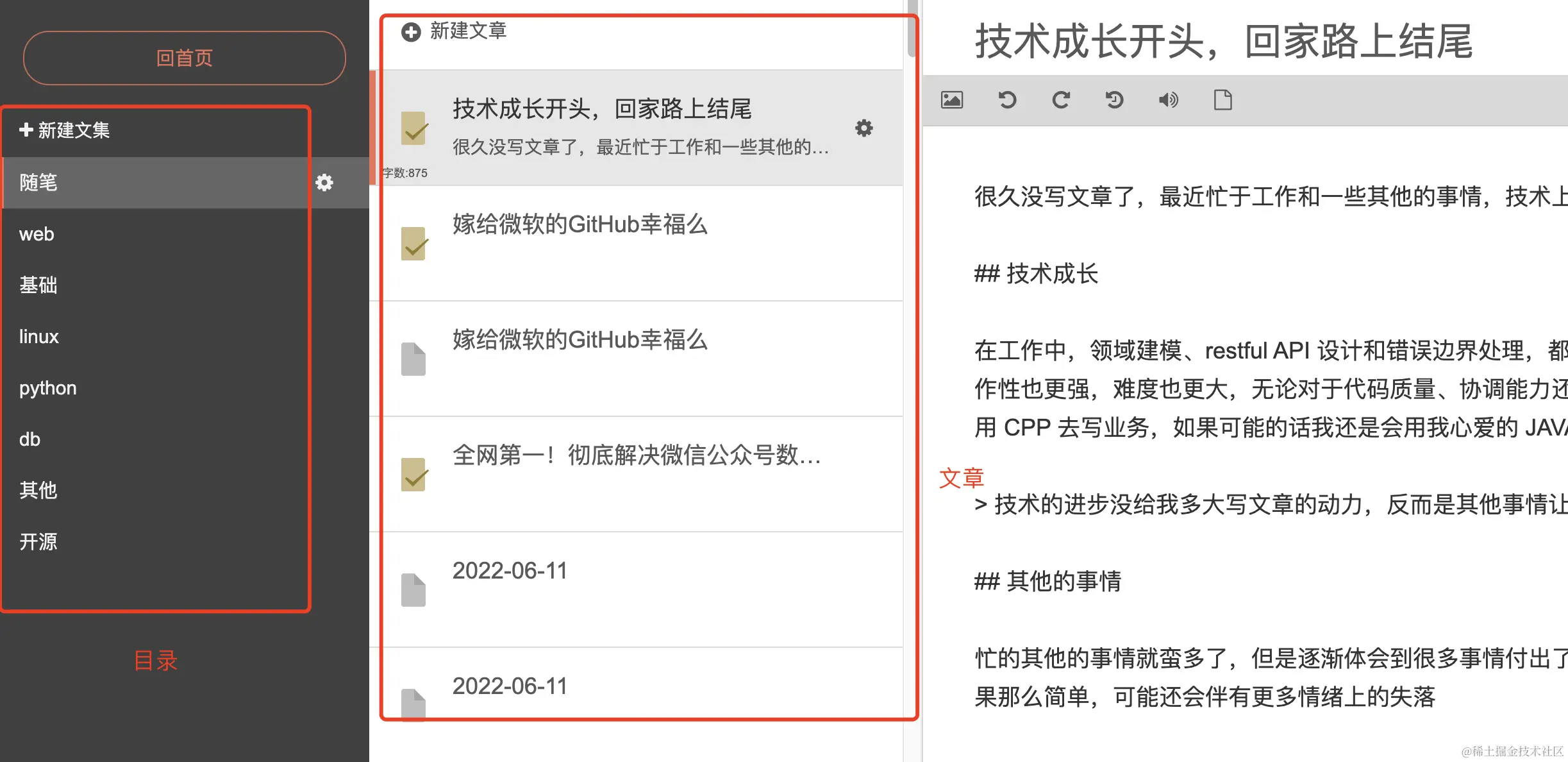 所以目录最终如何设计,既要解决用户的文章管理问题,也要考虑文集扩展性,类似于简书的形式对外表现就较为简单,而语雀由于目录层级多就会更为丰富