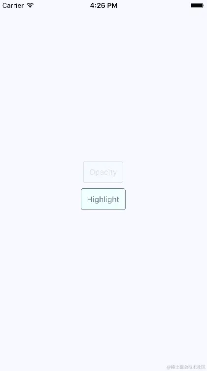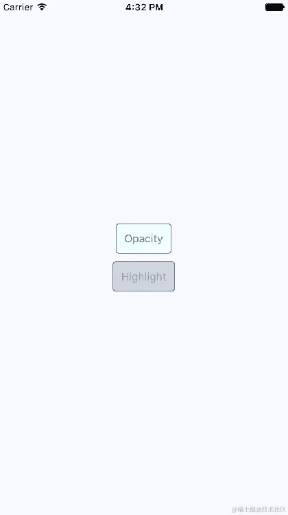 这里渲染了两个按钮,顶部的按钮标有“Opacity”当前正在被用户按下。当按下时,按钮的不透明度会变暗,这为用户提供了重要的视觉反馈。让我们看看当按下时TouchableHighlight按钮的外观,如下所示: