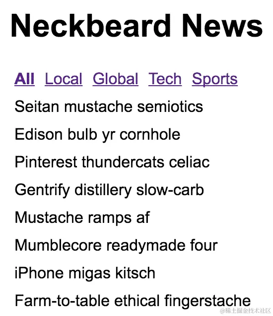 在移动应用中,实际上使用 Redux 并没有什么不同。唯一的区别在于所使用的状态的形状。换句话说,不要认为你可以在网页和原生应用的版本中使用完全相同的 Redux 存储和减速器函数。想想 React Native 组件。许多事情并没有一种大小适合所有的组件。你有一些组件针对 iOS 平台进行了优化,而其他一些则针对 Android 平台进行了优化。Redux 状态也是同样的道理。以下是移动应用Neckbeard News的初始状态:
