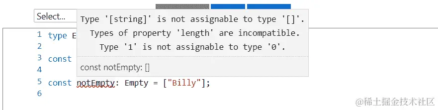 毫不奇怪,我们会得到一个编译错误。如果我们悬停在500上,编译器会正确地抱怨它期望一个字符串。如果我们悬停在"Table"上,编译器会抱怨它期望一个数字:
