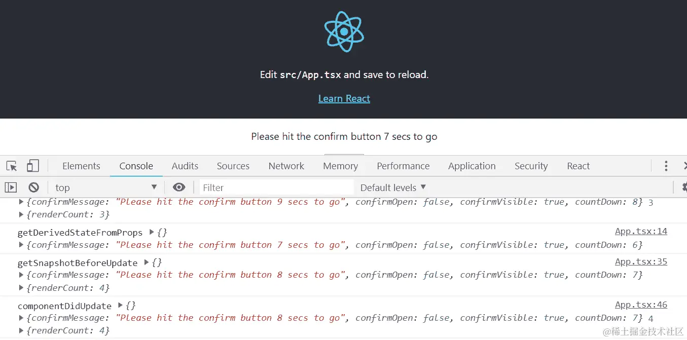 如果我们查看运行中的应用程序和控制台,我们会看到每次App组件倒计时时都会发生渲染。倒计时是在App组件状态中的,状态的改变意味着组件将被重新渲染,以及任何子组件。这就是为什么,没有任何优化的情况下,我们的Confirm组件在每次倒计时时都会被渲染。