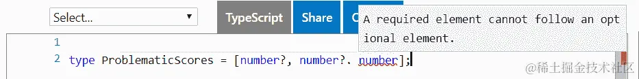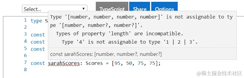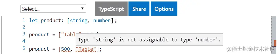 - 在 TypeScript playground 中,让我们创建一个元组,第一个元素是字符串,后续元素是数字: