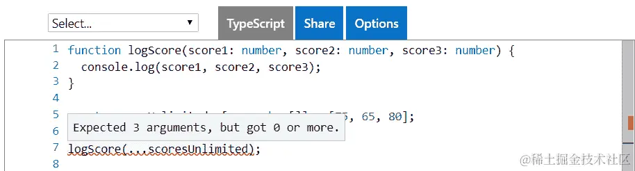 如果您正在使用 TypeScript playground,您将收到编译错误,期望 3 个参数,但得到 0 个或更多。尽管如此,程序仍然运行,因为这是完全有效的 JavaScript。如果我们运行它,75, 65, 80将被输出到控制台。