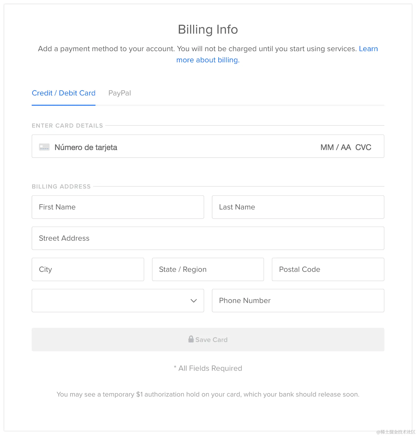 首先,你需要创建你的 Digital Ocean 账户,访问www.digitalocean.com。你可以使用你的 Google 账户注册;这是推荐的方式。一旦你点击使用 Google 注册的链接,你将看到账单信息视图:
