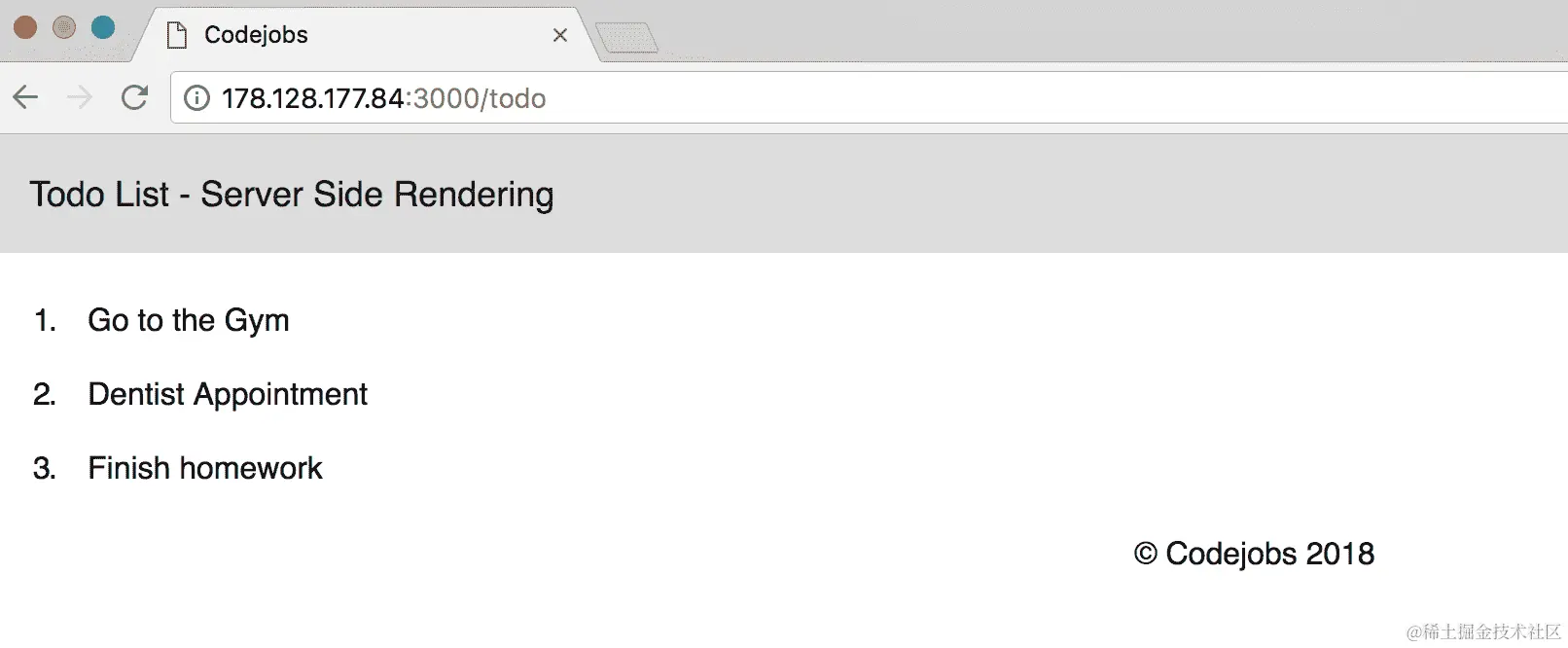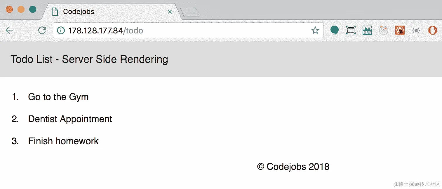 如果您想验证它是否有效,请转到浏览器并打开 Droplet 的 IP,然后添加端口 3000—在我的情况下将是http://178.128.177.84:3000,如果一切正常,您应该看到您的应用程序(在我们的情况下,我们将打开我们的/todo 部分):