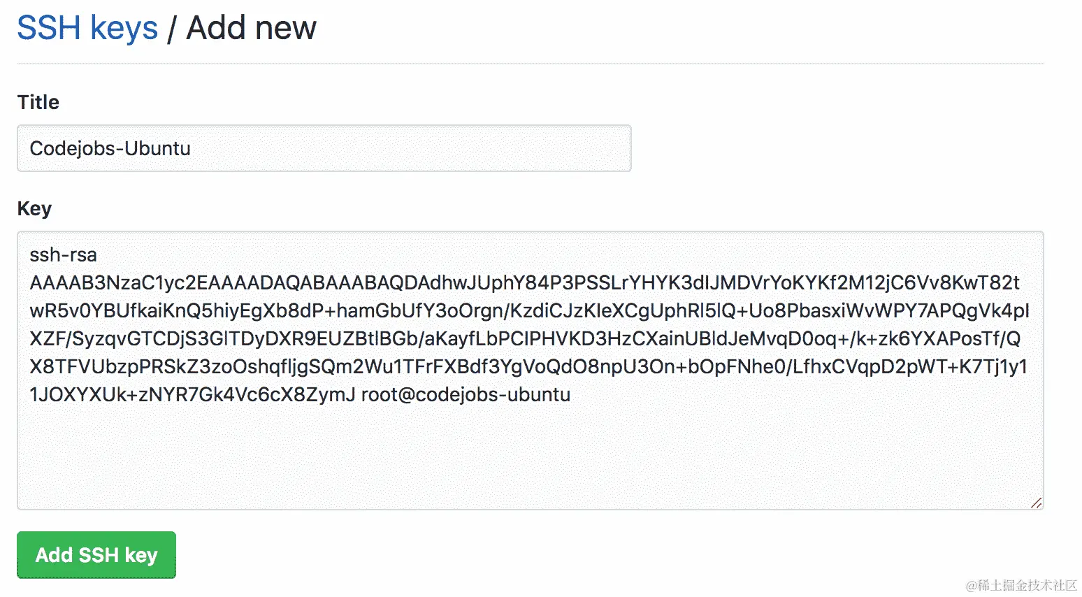 创建 SSH 密钥后,您可以通过执行以下操作查看它:vi /root/.ssh/id_rsa.pub。您需要复制 SSH 密钥并转到您的 GitHub 帐户|设置|SSH 和 GPG 密钥(github.com/settings/ssh/new)。然后将密钥粘贴到文本区域中,并为密钥添加一些标题。单击“添加 SSH 密钥”按钮时,GitHub 将要求您输入密码以确认: