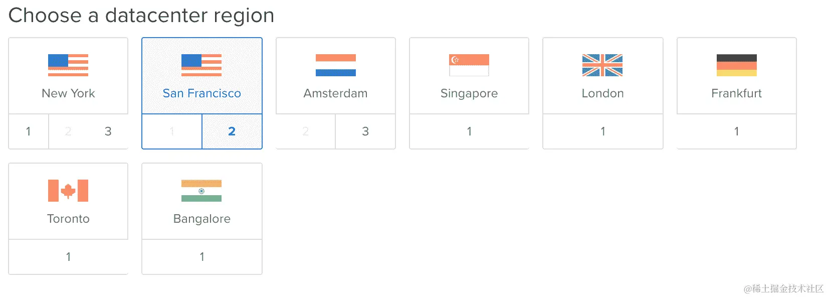 - 选择数据中心区域;这将取决于您的位置。如果您在美国,您需要选择纽约或旧金山。您需要选择距离您位置最近的数据中心: