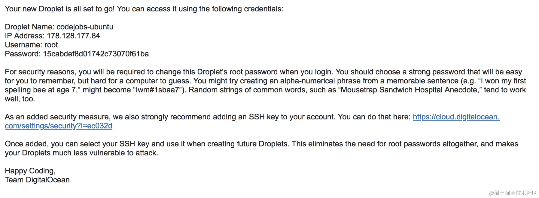- 此时,您应该会收到一封包含服务器凭据的电子邮件: