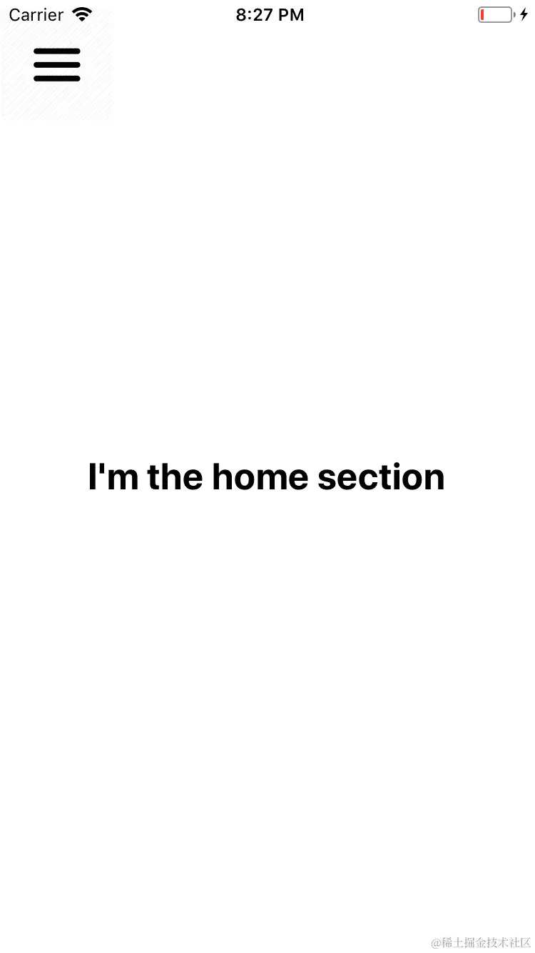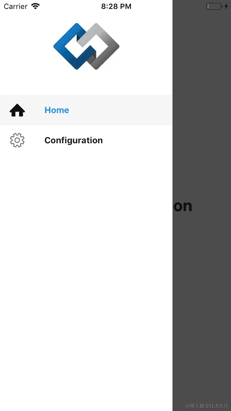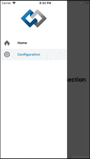 正在呈现的第一个组件是Home组件。如果您点击汉堡菜单,您会看到抽屉中有两个部分(Home和Configuration),它们各自的图标以及顶部的 Codejobs 标志:
