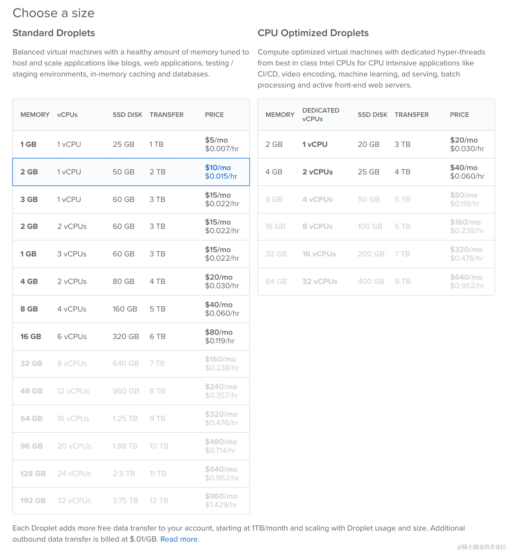 选择您的 Droplet 的大小。我更喜欢使用 2GB 内存的 Droplet,每月费用为10 美元。也许您会想为什么我不选择最便宜的 1GB 内存版本;这是因为我曾尝试使用这个版本,但我注意到1GB 内存不足以处理安装包时的 NPM。大多数情况下,这会使您的 Droplet 挂起——我知道这听起来很荒谬,但 NPM 消耗大量内存。