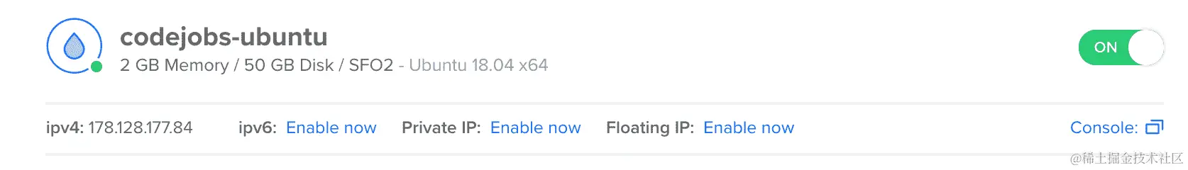 - 点击“创建”按钮后,将需要 30-45 秒来创建您的 Droplet。完成后,您将看到您的 Droplet: