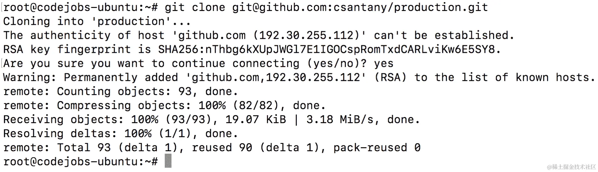 现在我们可以使用git clone git@github.com:csantany/production.git克隆我们的存储库,或者您的存储库: