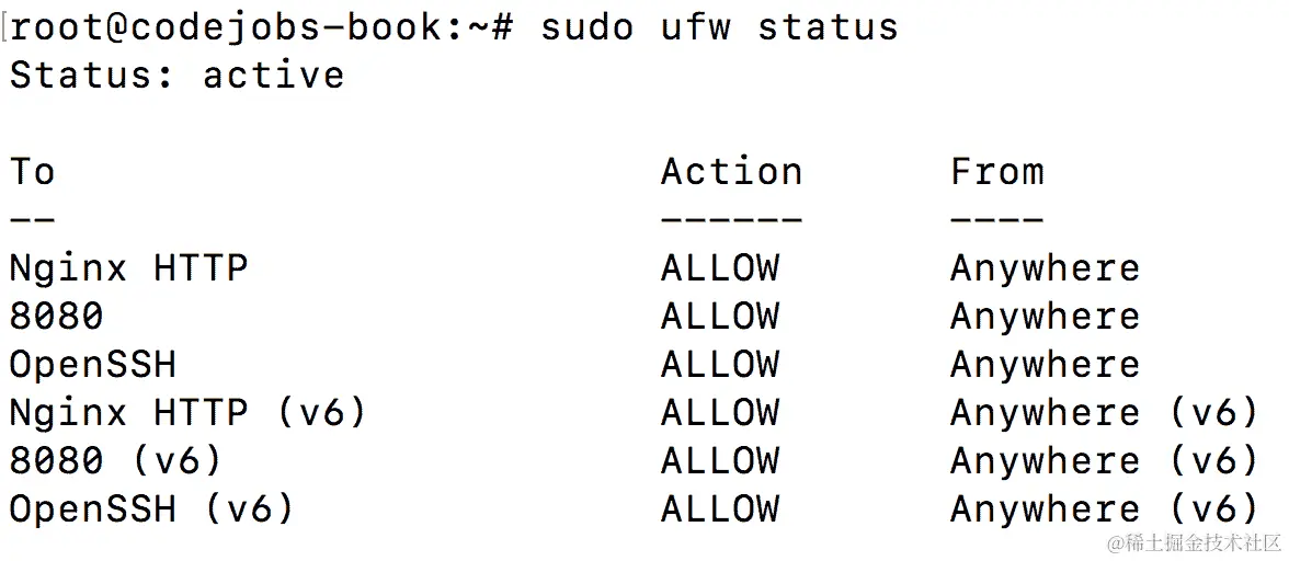 Nginx Full意味着我们将允许端口 80(HTTP)和 443(HTTPS)的流量。在这一点上,我们还没有为 SSL 配置任何域,所以我们应该限制流量只通过端口 80(HTTP)传递: