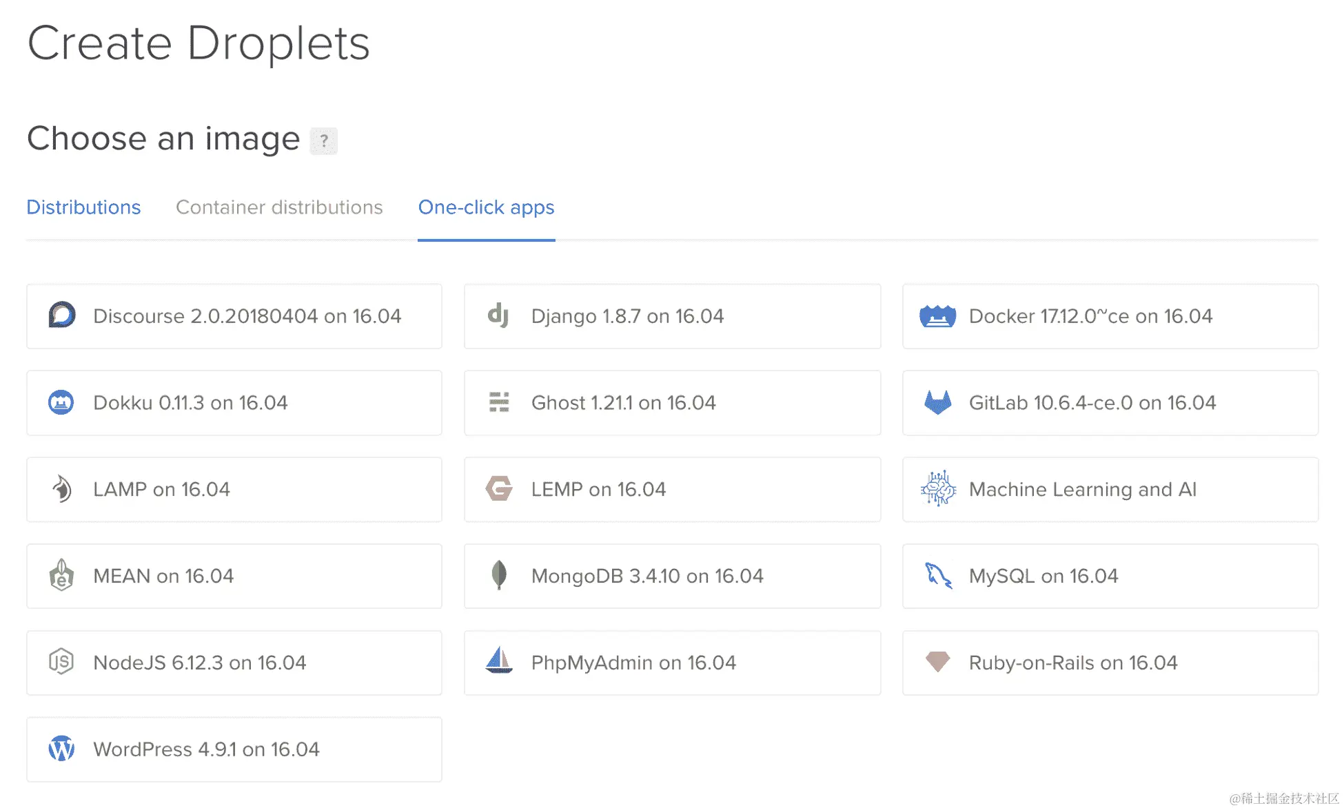 - 一键应用是预配置的 Droplet,但我更喜欢从头开始设置我的 Droplet,以便拥有控制权并能够优化我的配置。在此之后,如果您需要快速配置某些内容,可以查看这些选项: