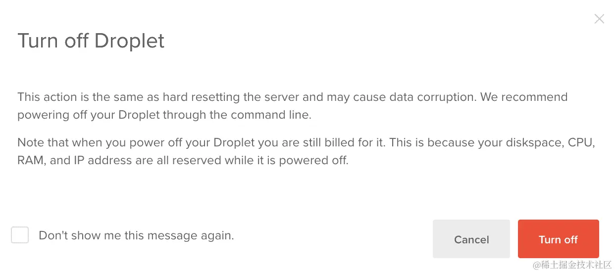 如果您选择了 10 美元的 Droplet,您不必立即支付这笔钱。Digital Ocean 最好的一点是他们只会按您使用 Droplet 的时间收费。这意味着如果在完成此操作后(假设您花了 2 小时来完成它),您关闭(关机)您的 Droplet,您只会被收取 2 小时的费用,即0.030 美元。如果您将 Droplet 保持开启一个月(30 天),您将被收取 10 美元,所以不用担心: