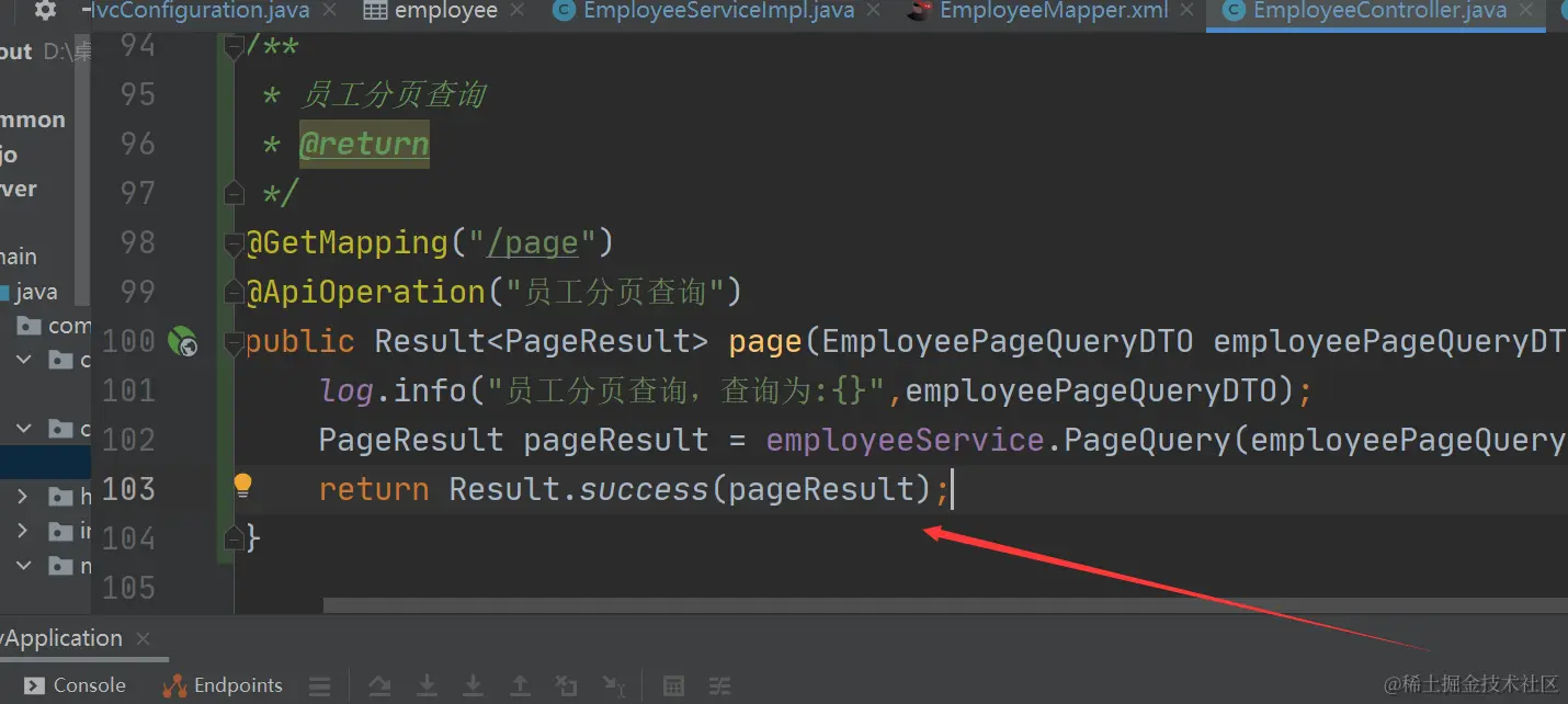写员工管理类:看管理端接口写,用PostMapping或GetMapping或Putmapping注解看接口,注解里面写什么路径也是来看接口,前面@RequestMapping("/xx/xx")路径已经写过则只用写最后面没有写过的就行。正常操作调用employeeService.方法();然后Create method 'update'in 'Employeeservice,然后EmployeeServiceImpl实现类中重写该方法,同样进行一系列操作,返回结果语句都是return Result.success();括号里面写什么具体看Result泛型里面定义的是什么,没有定义泛型就不用写。