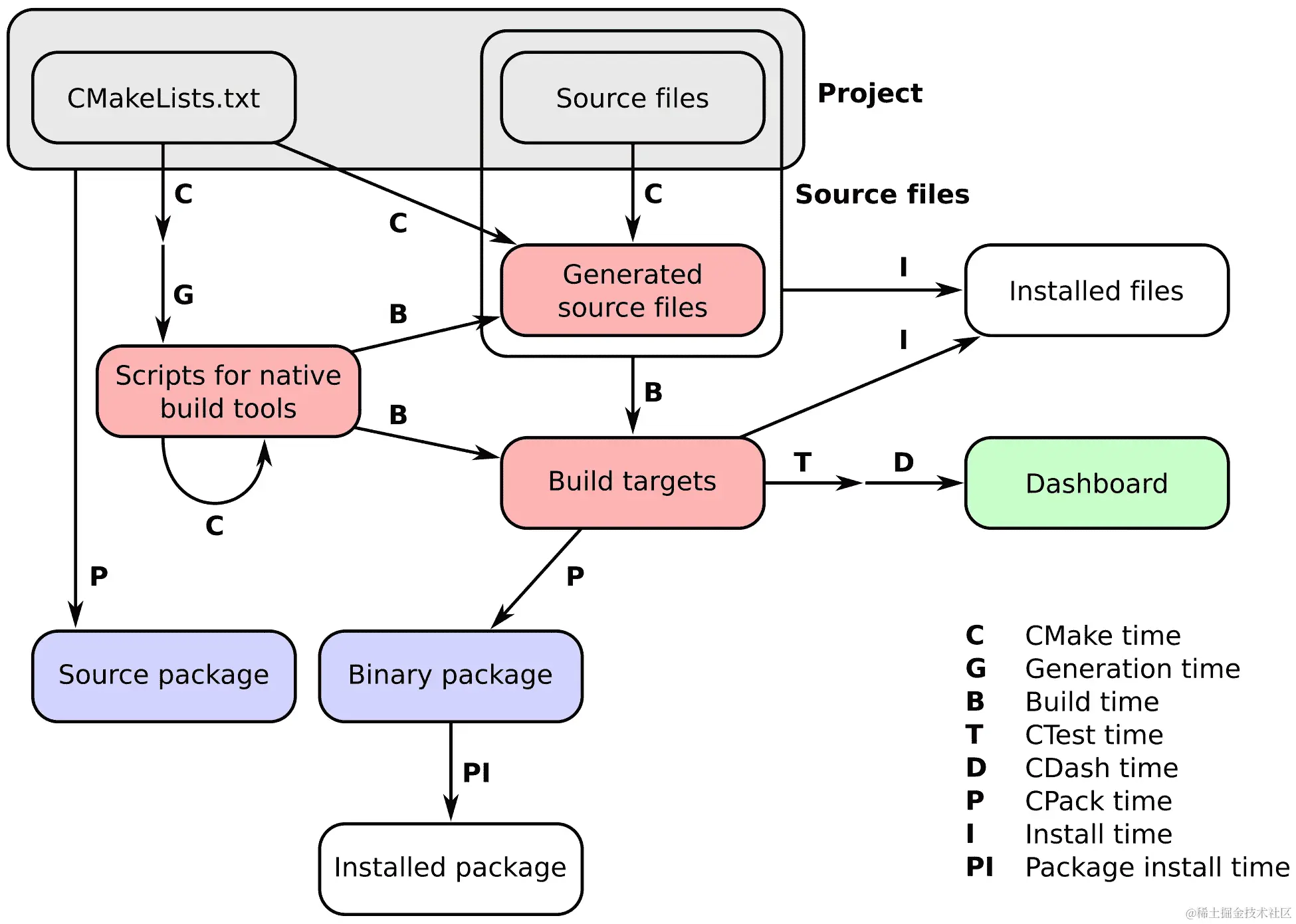 在前几章中,我们已经展示了如何使用 CMake 配置、构建和测试我们的项目。安装项目是开发者工具箱中同样重要的一部分,本章将展示如何实现这一点。本章的节涵盖了以下图中概述的安装时操作:
