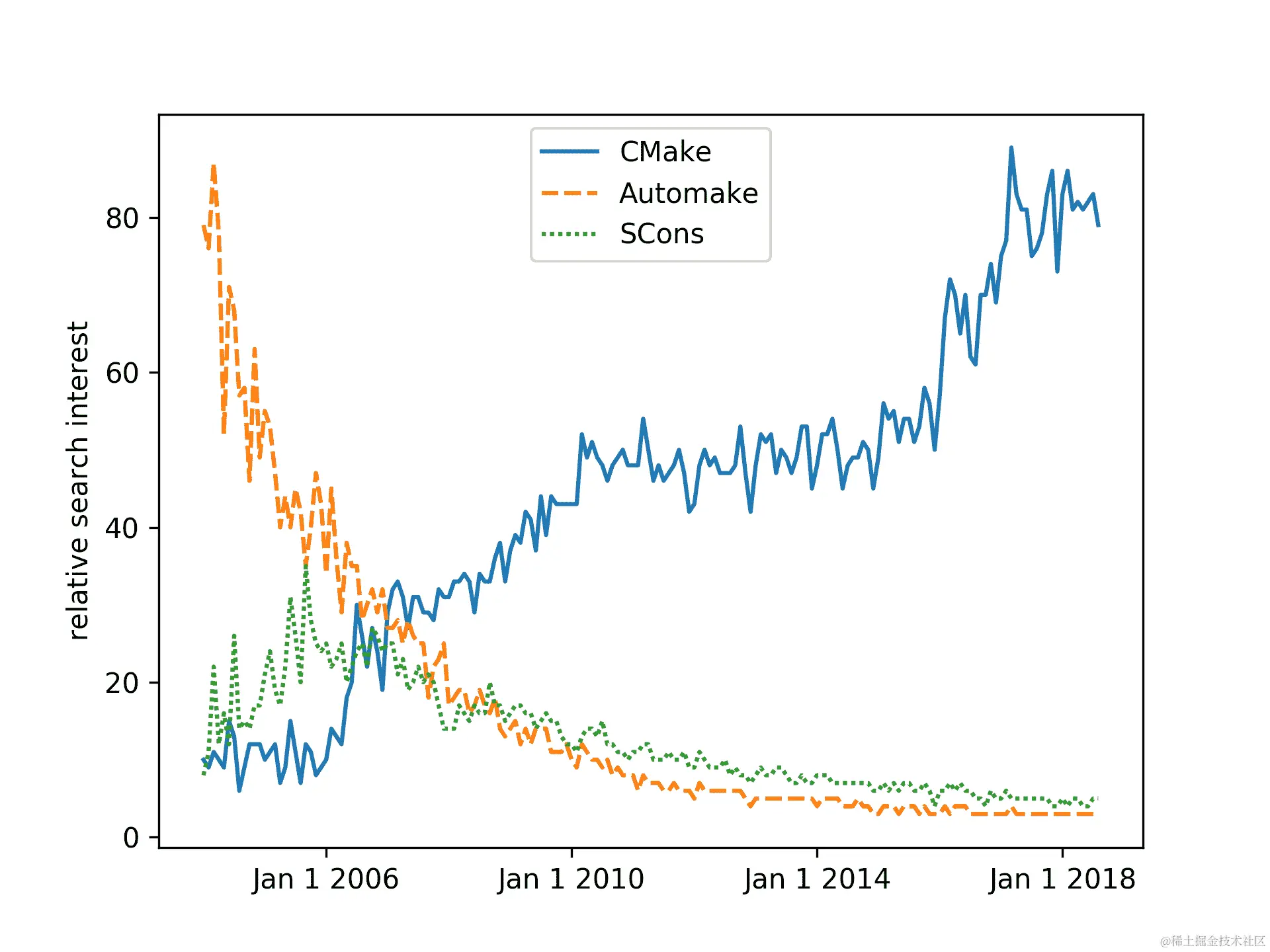 (搜索兴趣随时间变化,针对三个流行的构建系统:CMake、Automake 和 SCons。兴趣是通过对相关术语的搜索次数来衡量的。该图表是使用 Google 趋势提供的数据获得的。)