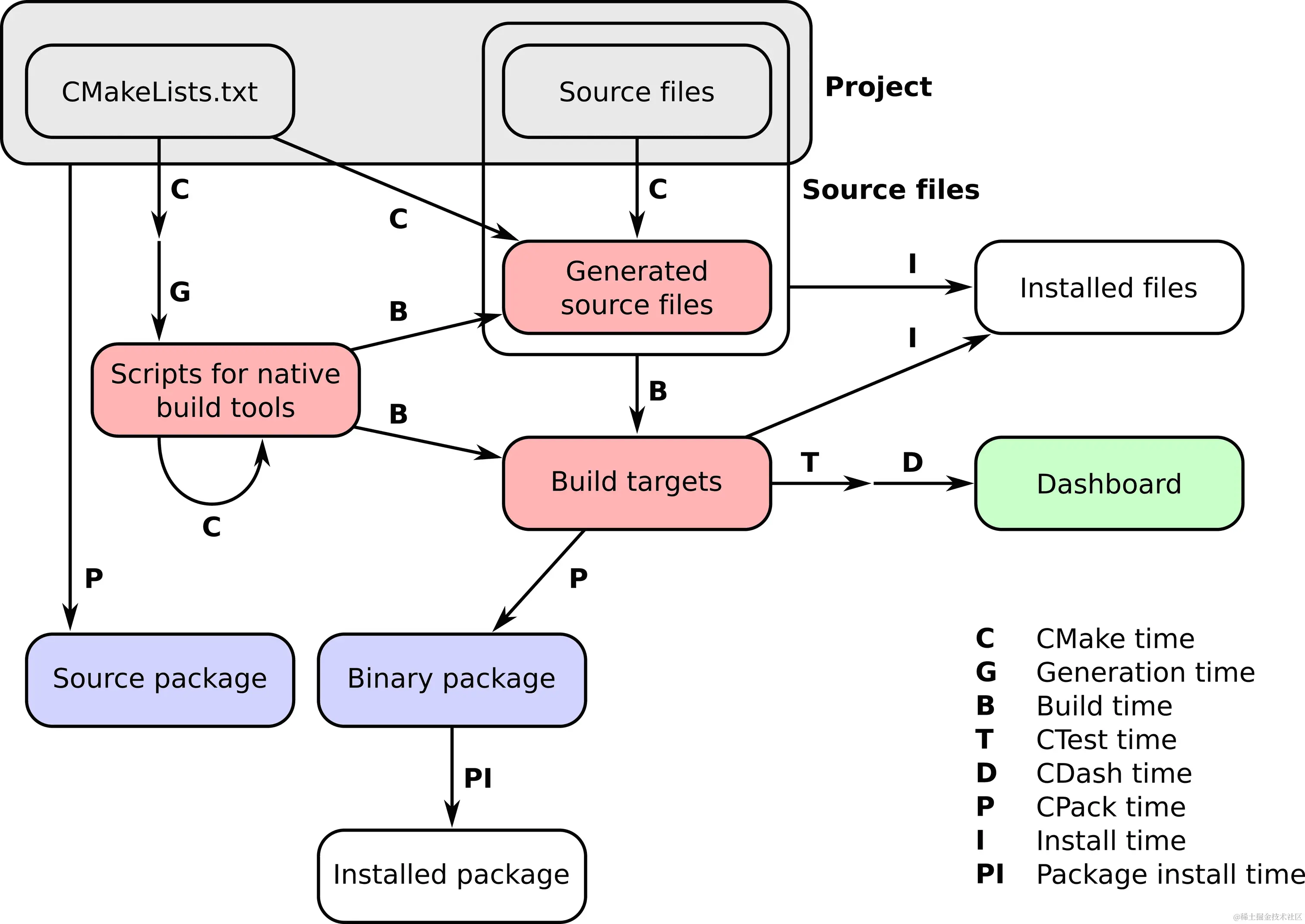 由 CMake 管理项目的流程发生在多个阶段,我们称之为时刻。这些可以简洁地概括在以下图中: