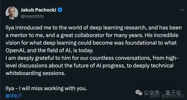对于 Ilya 的离开,Jakub 本人表示: