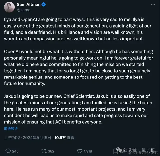 伊利亚和 OpenAI 即将分道扬镳。这让我非常难过;伊利亚是我们这一代最伟大的思想家之一,是我们这个领域的指路明灯,也是我们的挚友。