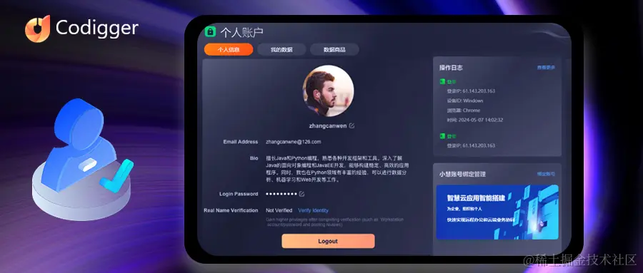 个人账户管理集成操作日志与小慧账号绑定功能,支持多账号切换管理。平台数据信息详尽,涵盖商品名、APP名、工作站名、更新时间、数据来源及操作记录,助力开发者实时、高效管理数据资产。