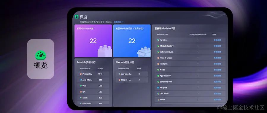概览界面: 系统管理提供了一个清晰的概览界面,实时展示已安装和启用的模块数量及详情。此外,还提供了插件(Module)安装排行和插件(Module)销量排行,让开发者对模块管理一目了然。