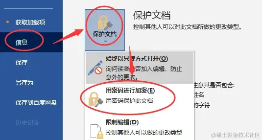 步骤3:在信息选项卡中,找到【保护文档】 功能,点击【用密码进行加密】;