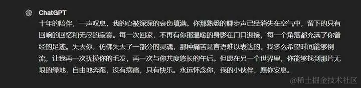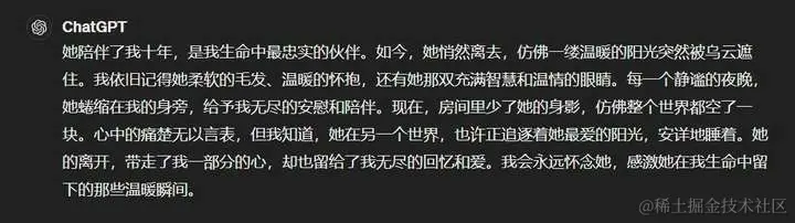 在情感理解方面的描述上,GPT4o把猫拟人化了,至少提了一下最忠实的伙伴,感觉去世的像是猫娘。而GPT4直接描述的就是猫娘,对猫的感情刻画跟对的人一模一样,所以情感表述方面两个版本都还待加强。