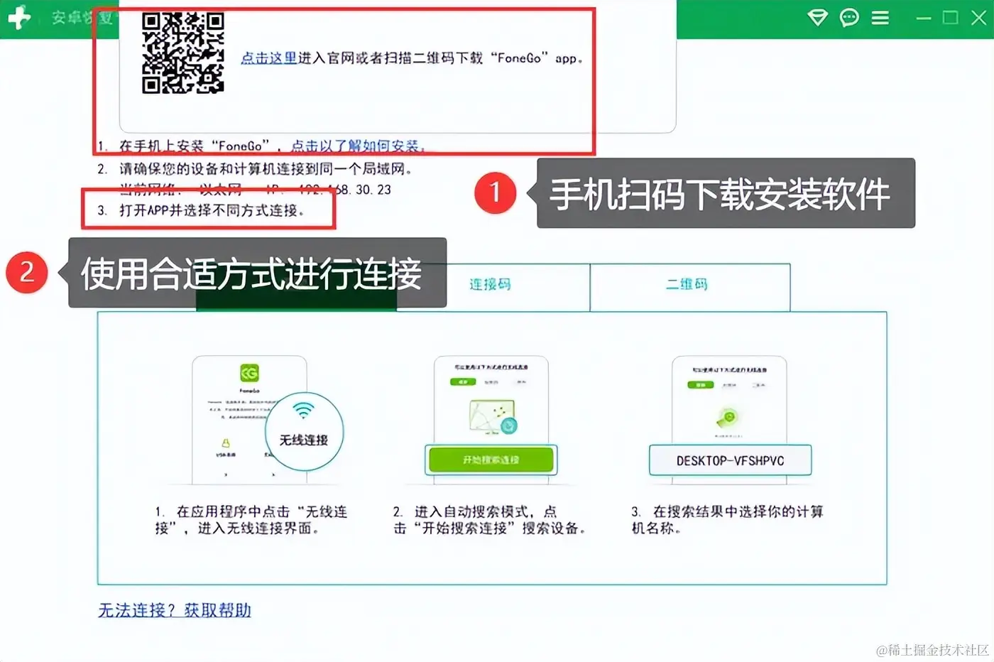 步骤1:电脑上安装好之后,根据提示在手机上安装【FoneGo】,打开后连接电脑,可以使用USB有线连接也可以无线连接,只要注意查看连接要求即可轻松连接。